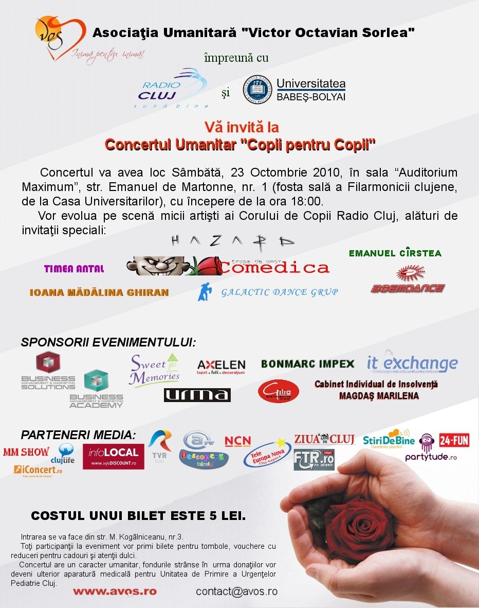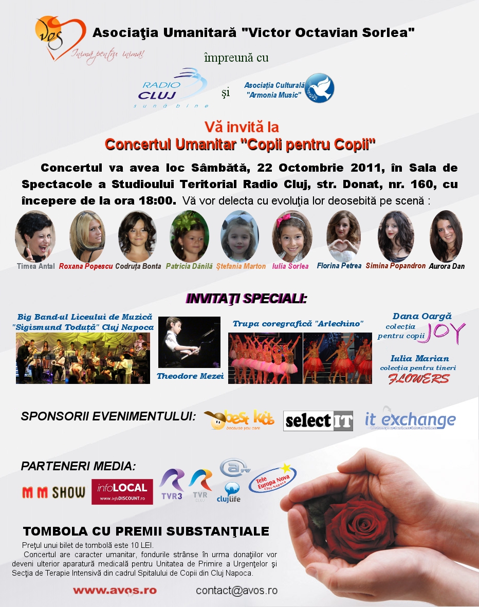 Sambata, 22 Octombrie 2011, Asociatia Umanitara 'Victor Octavian Sorlea' in parteneriat cu Radio Cluj si Asociatia Culturala 'Armonia Music' va invita la Concertul Umanitar 'Copii pentru Copii' al carui scop nobil este strangerea de fonduri pentru dotarea cu aparatura medicala a Unitatii de Primire a Urgentelor (UPU) si a Sectiei de Terapie Intensiva (ATI), din cadrul Spitalului Clinic de Urgenta pentru Copii, Cluj Napoca.