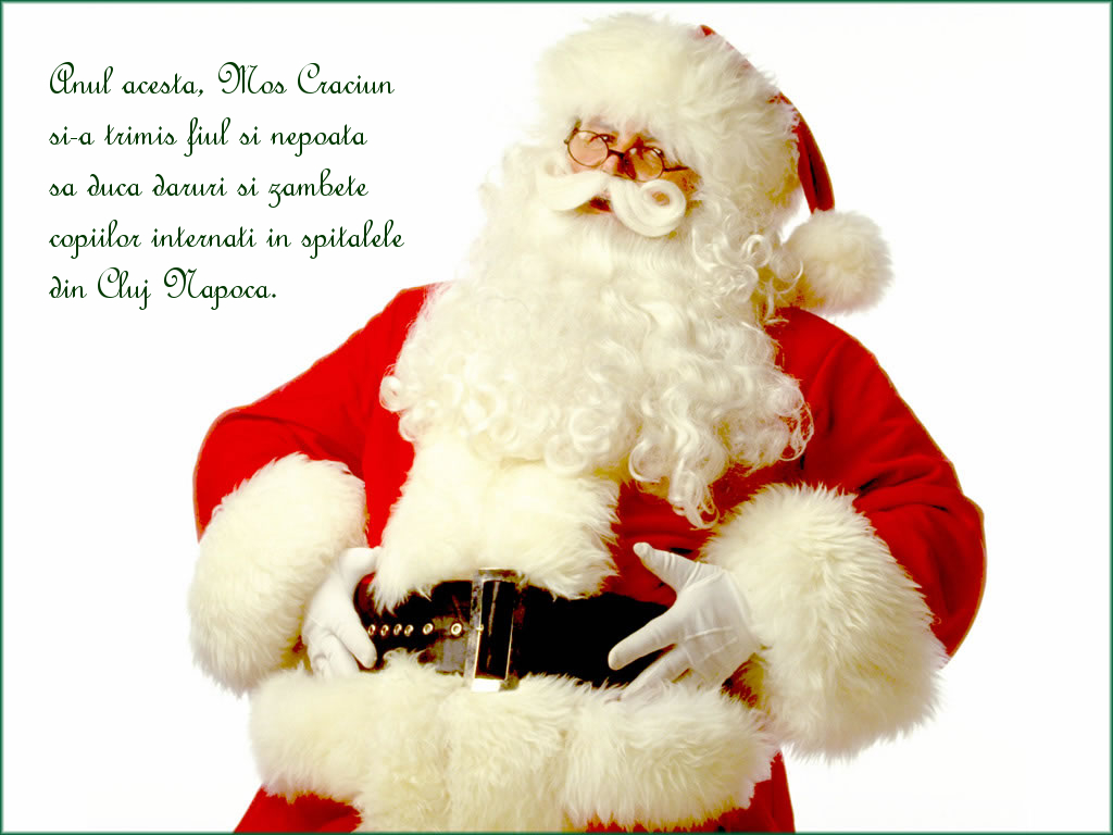 In prima zi am vizitat impreuna cu Mosul (junior) Clinica de Pediatrie II din Cluj Napoca. Am pornit la drum cu dorinta de a aduce putina bucurie copiilor aflati in preajma Craciunului in spital. Insa planul de acasa si cu cel din targ... stiti voi povestea. Ajunsi acolo am descoperit ca nu noi am impartit bucurie, ci acesti copii minunati au fost cei care ne-au adus bucurie. Si nu putina. Ne-au cantat, ne-au colindat, ne-au spus poezii si ne-au oferit cele mai minunante zambete. Mosul ne-a marturisit ca se simte din nou ca la 180 de ani.